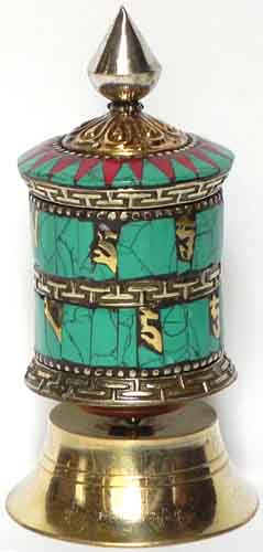 Prachtvolle Stand Gebetsmühle mit Türkisen und Koralle versilbert Ø 4 cm